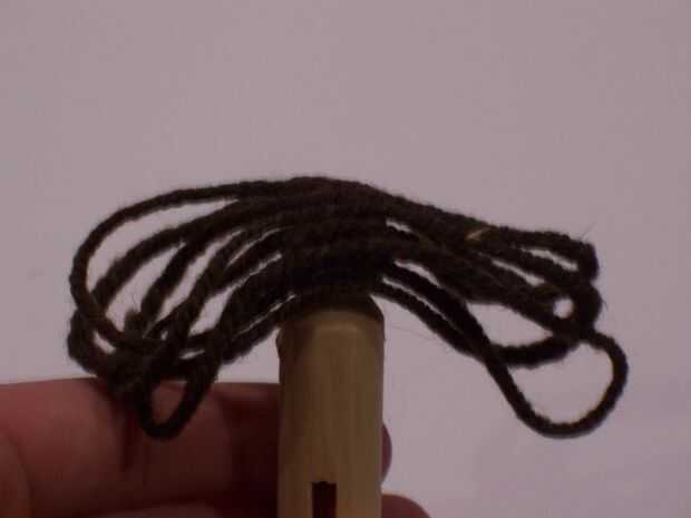 Para el hilado, tomar de 1 yarda de hilo angosto y bucle hacia atrás y hacia adelante varias veces como se muestra.
