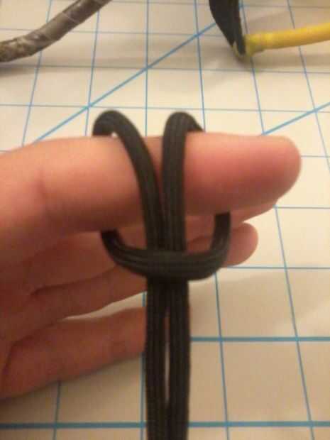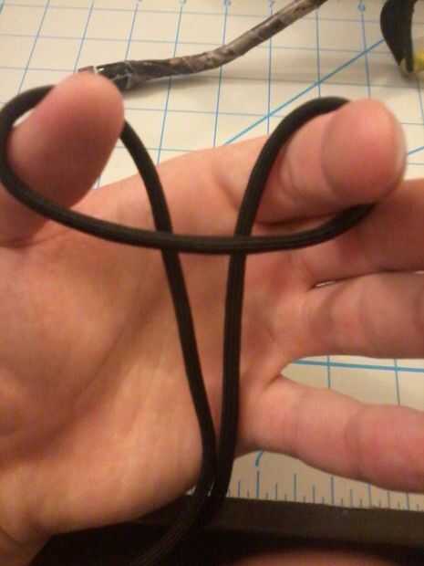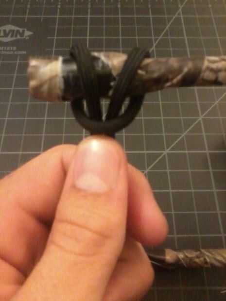 Primero apagado tuve que modificar mi slingshot para colocar y sostener 8 bahías de cable y lo hice con un poco de cinta adhesiva. Hacer el nudo de cabeza de alondra y ponerlo alrededor de uno de los soportes de metal de la muñeca. Potencialmente podría ponerlo directamente en el metal pero decidí que no quería cualquier oportunidad de la banda de deslizarse apagado.