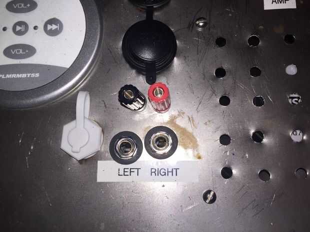 Nota clave: Si tienes un panel de metal, tienes que aislar las conexiones de altavoz desde el panel de metal. De lo contrario, se oye alguna mala estática a volumen alto. Usé una arandela de goma por debajo y encima del panel. También cortar algunos cinta plástica y envuelto alrededor de los tornillos de la roseta. Esta es una solución temporal para mí. Voy ya sea para reemplazar el metal con madera o voy a hacer una sección de panel de madera pequeño para las tomas de altavoz. Preveo sobre un rectángulo de 4-ish pulgadas de madera para sujetar los conectores de altavoz en el panel.