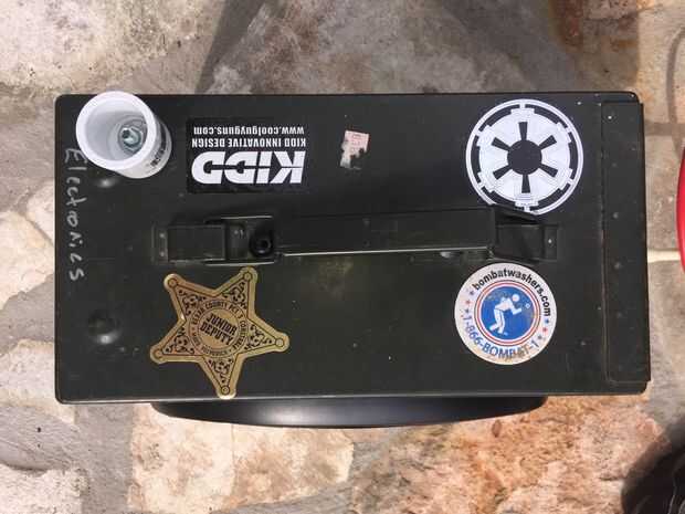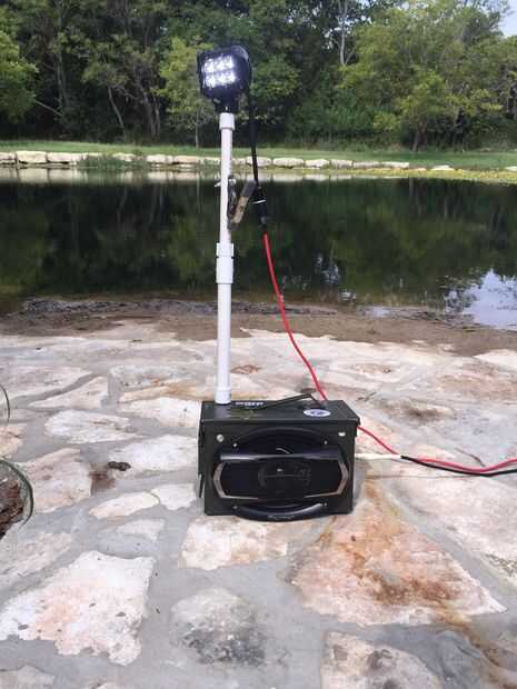 - Perfore un agujero en otra tapa de 3/4" PVC. Coloque esto en la parte superior de los altavoces de caja de munición (cuidadosamente haga un orificio en la tapa de la caja de munición - no taladre en el altavoz) Utilice una arandela de seguridad. Esto es cómo conectar las luces a la caja del altavoz.