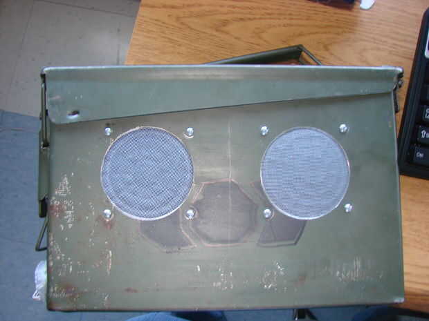 midió los altavoces y marcados los agujeros en la lata, para que todos se alinean arriba y simétrica y por suerte había un pedacito de taladro