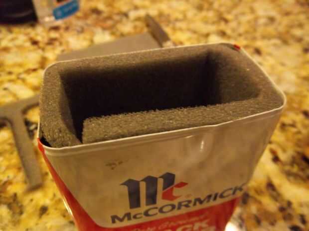 Cuidadosamente Envuelva el recorte de espuma fina en la lata y luego medir la espuma de la tapa. Sí, la tapa también necesita espuma para evitar que la munición hace tanto ruido. Con pegamento para fijar la espuma a la tapa y estén casi hechas.