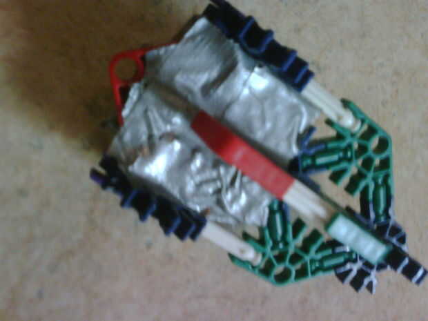 aquí es: mi cañón. Dispara misiles grandes y les tira duro. Es accionado por 48 gomas, atados en 8 cadenas de 6. Es 2 pies de ancho (en la proa) y 5 pies de largo.  Tiene un rango promedio de cerca de 100 pies de la posición de reposo. Utiliza un mon