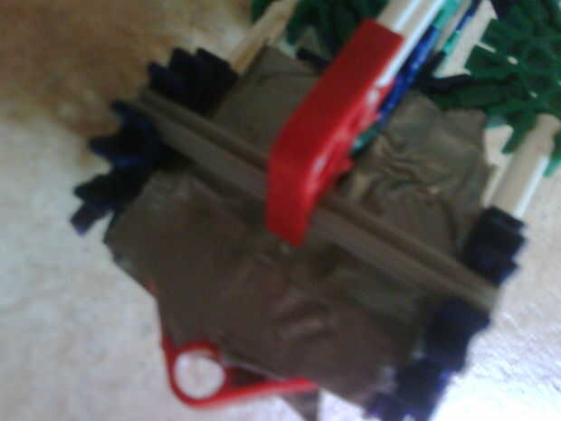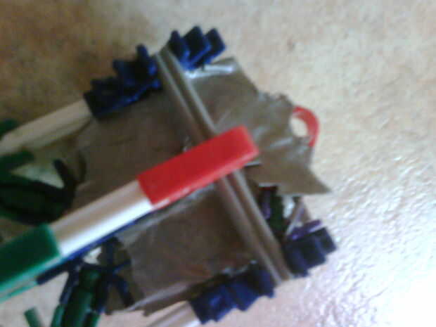 aquí es: mi cañón. Dispara misiles grandes y les tira duro. Es accionado por 48 gomas, atados en 8 cadenas de 6. Es 2 pies de ancho (en la proa) y 5 pies de largo. Tiene un rango promedio de cerca de 100 pies de la posición de reposo. Utiliza un mon