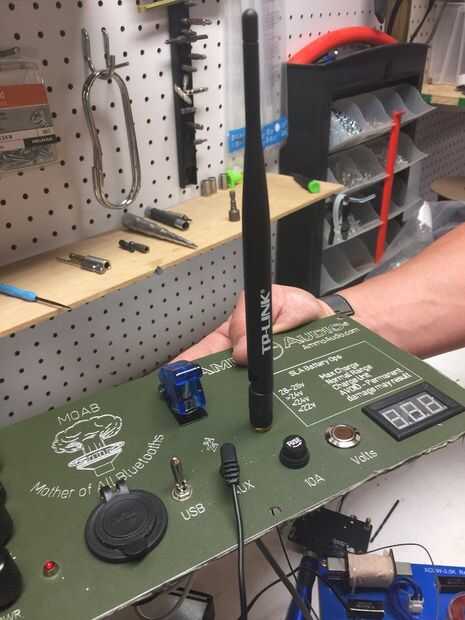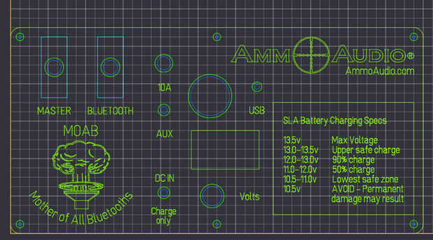 Un panel de control fresco es una necesidad para una estructura como esta, ya que hay mucho control! Nos CAD hasta el diseño y corte con CNC. La parte de atrás está llena de estera acústica como el material utilizado en instalaciones estéreo del coche. Esto amortigua las vibraciones de los interruptores y con la acústica de la caja del MDF. Si no tienes acceso a un CNC puede utilizar una pieza de ABS, MDF o cualquier cosa que usted puede utilizar para montar los conmutadores y utilizar para cubrir la cámara sonida interior. De izquierda a derecha hay los controles del amplificador, el puerto de carga USB, Aux en Puerto, fusibles, toma de antena de bluetooth y el volmeter y su correspondiente interruptor momentáneo. Grabado en el panel son nuestras recomendaciones para la carga de la batería de SLA.