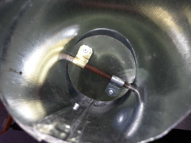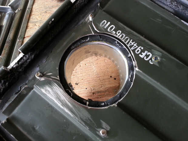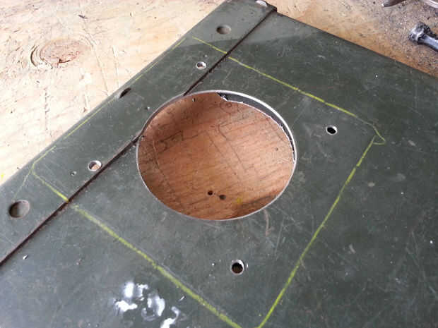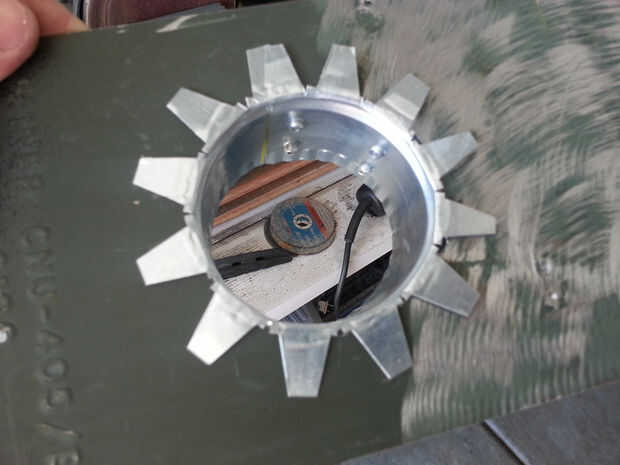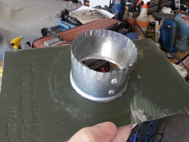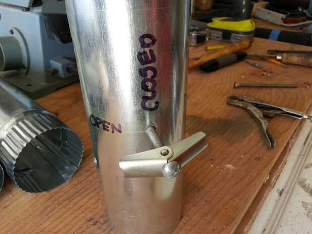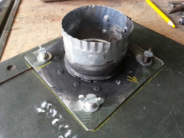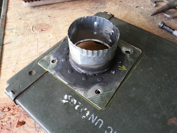 La chimenea es 3" aire conducto tubo cortado en 4 trozos con una detención de humo y chispa- o. La base de la pila está diseñada para revertir para el viaje y asegura con 1/4" tornillos del ala de encargo hecho a la tapa de la caja sobre un orificio de 3-1/4". Colapsan de todas las piezas para caber dentro de la caja para almacenamiento y viajes.