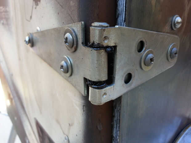 Uno de los cambios que hice después de la quemadura, la puerta las bisagras vinieron con arandelas de plástico que lo derretiría después de la quemadura, de tierra de la clavija de bisagra y reemplazándolas por otras de acero. Pernos de bisagra nueva y estaban en el negocio. He lijado toda la pintura vieja de y le dio una capa de pintura resistente al calor.