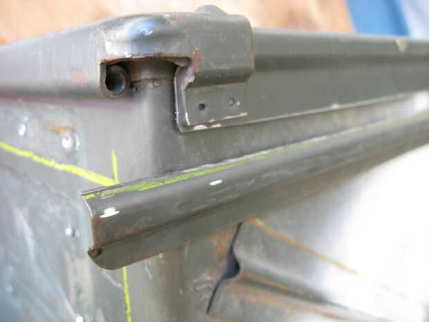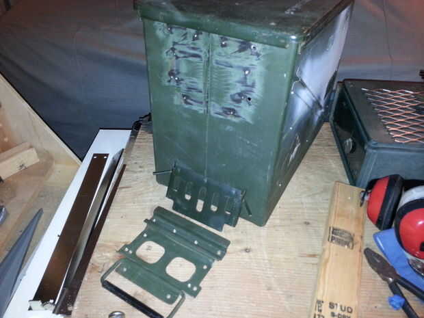Para lograr esto, tuve que quitar las placas, cierres y manijas en ambos extremos que fueron punto soldado con autógena. Simplemente había atascado un destornillador entre la caja y la placa y taladrar los puntos de soldadura hasta que "apareció". Repetir este proceso hasta que las placas se caen. Utilice un molino o un archivo para suavizar cualquier asperezas. Dejé el soporte metálico diagonal en el lado izquierdo para mayor rigidez.