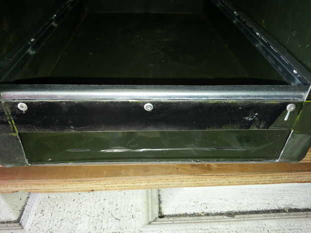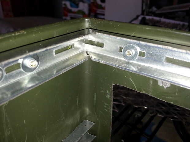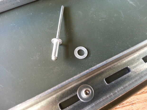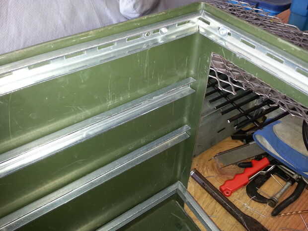 Usé "U" en forma de soportes de pared de acero (sin recubrimiento) que mide 5/8" ancho x 3 X 8" alto y corte a las secciones largas de 17". Éstos eran todos pop remachado al lado con remaches de 1/8' y arandelas pequeñas, 3 o más para cada soporte.