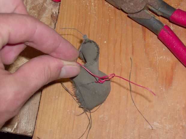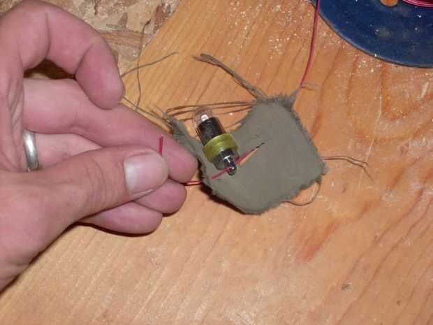 Doblar la pieza de tela por la mitad. Corte un pequeño agujero cerca de la tapa en el centro de la tela. Desplegar a la tela y coloque el led entre los dos agujeros en la tela. El trozo de alambre a través del primer agujero, todo en la parte inferior del led, luego a través del segundo agujero en la tela del hilo de rosca. Atar los dos extremos del alambre juntos firmemente.