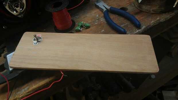 Mi consejo amplificador había terminales de tornillo en él, así que les desoldar y soldar alambre real en su lugar. Corté dos trozos de madera, uno para ir en la parte inferior por lo que se puede enroscar su electrónica (volver a hacerlo, con la teoría de lágrimas de boo boo) y otro para el panel de control (siguiente paso)