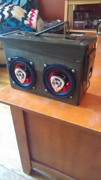 este es mi altavoz puede de munición. tiene Bluetooth y suena bastante bien. muy fácil de hacer.Paso 1: historia esto es realmente mi segunda munición puede altavoz (bueno, en la misma lata de munición)arriba son fotos de la anterior amplificador y a