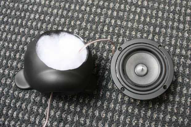 El cable del altavoz a través del cuello del hilo de rosca y rellenar la cabeza con algunos polyfill.
