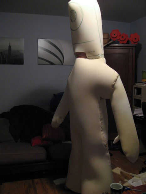Comencé haciendo que el cuerpo de espuma. Primero medí la altura aproximada y dimensiones y luego dibujé el Muno a mano alzada en la espuma. Asegúrese de alinear la boca con los ojos de la persona dentro. Antes de cortar nada, amplió los brazos y las piernas para compensar la curvatura que va a pasar cuando se unen las 2 capas juntos (es decir, hacer que 3D). Una vez más, tenga en cuenta las medidas de la persona que va usar. Sus brazos, piernas, caderas etc. necesitan caber dentro y necesitan una gama razonable de movimiento.
