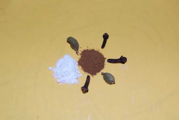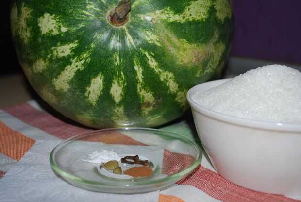 Ingredientes: 1 gruesa piel pequeña de melón de agua de tamaño medio. Se utiliza sólo la parte blanca debajo de la piel. Esta receta utiliza 1,2 kilos de la parte blanca. 1,7 kilos de azúcar, 1 cda de bicarbonato de sodio, un tercio de cucharadita de canela en polvo, 2 semillas de cardamomo, 3 clavos de olor y un tercio de cucharadita de vainilla en polvo (ver foto primer plano de especias y vainilla en polvo). Usted también necesitará una gran variedad de cortadores de la galleta.