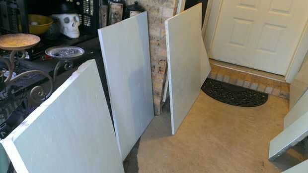 Una vez que haya determinado el tamaño de su área para el mural, es útil a disposición varios lienzos que tienes para cubrir el área a la derecha del piso hacia abajo para que pueda saber cuáles conectar junto con los soportes de tamaño. He utilizado varios lienzos de diferentes tamaños dependiendo de lo que he podido encontrar en las tiendas de segunda mano. Más tengo por $5 o menos mirando para los días de venta y etiqueta color descuentos. Esto era grande porque si compré algunos en las lonas nuevas en la tienda de artesanía el hubiera sido bastante un poco más para los más grandes que he encontrado. Reutilizar reutilizar, reciclar. No te preocupes si hay algo en ellos. Se pinta una capa base de un color claro o blanco para hacer borrón y cuenta con. Que tenga que trabajar esto como un rompecabezas para los lienzos para llenar la pared. Es más fácil hacerlo en el piso, ya que puede colocar nuevamente y mira montaje que todo se vea más uniforme. Permitió alrededor de una pulgada entre cada tela por todos lados por lo que no a tope hasta uno con el otro.