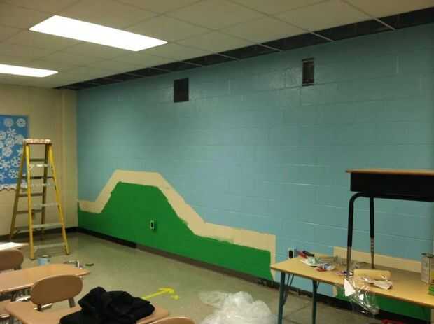 Esta parte es relativamente simple tiene sólo son laminación pintura sobre la pared. Es pared grande aproximadamente 30 pies por 9 pies, tomar algún tiempo pero todas las cosas consideran no mal.