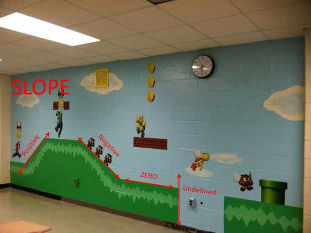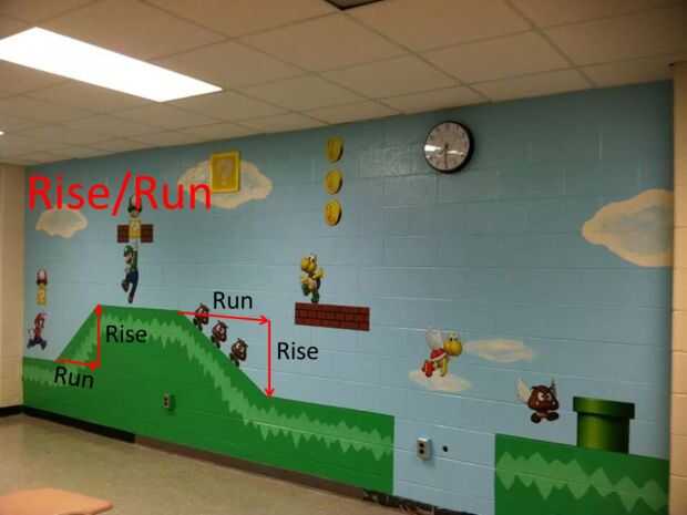 Los ladrillos que se utiliza para hacer realidad la pared sirven como una buena red. Aunque los ladrillos no son necesariamente cuadrados, todavía permite para que nos cuente el cambio horizontal y vertical cambio. El suelo es intencionalmente dos slopes(steepness) diferentes, por lo que podemos demostrar cómo la pendiente es un cociente o índice puede ser identificado por su inclinación y calculados sobre un gráfico o utilizar datos.