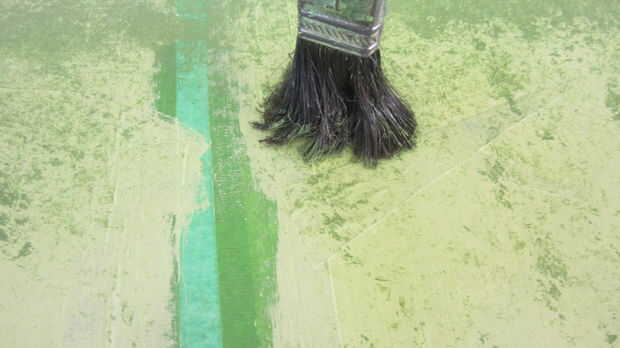Para dar el efecto de las hojas de los árboles, se aplicaron manchas de pintura verde oscurezca. Utilizamos el punteado para crear un degradado de color áspero que las transiciones de luz verde en la parte inferior de color verde oscuro en la parte superior.