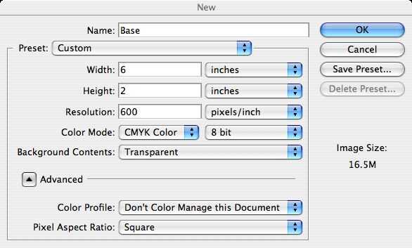 En primer lugar, he creado un documento nuevo a una pulgada por cada pie, así que para mi 6' x 2' pieza, he creado un documento de 6 "x 2" de 600 ppp, CMYK, 8 bits.