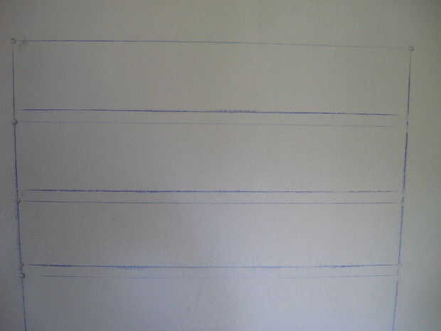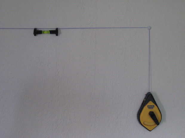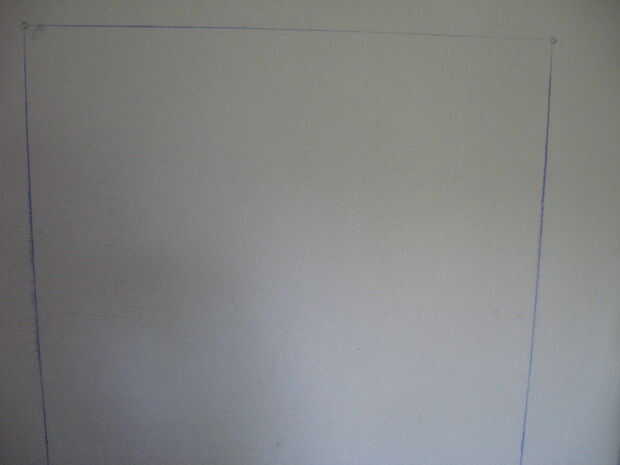 A partir de donde desea que una de las esquinas superiores, utilice su línea de tiza para trazar el borde superior un poco más ancho que el ancho final de la pieza incluyendo los espacios. Asegúrese de que esté nivelada, luego desde el mismo punto de partida, ejecute una línea de la pared para darle uno de los bordes laterales, repetir para el otro lado.