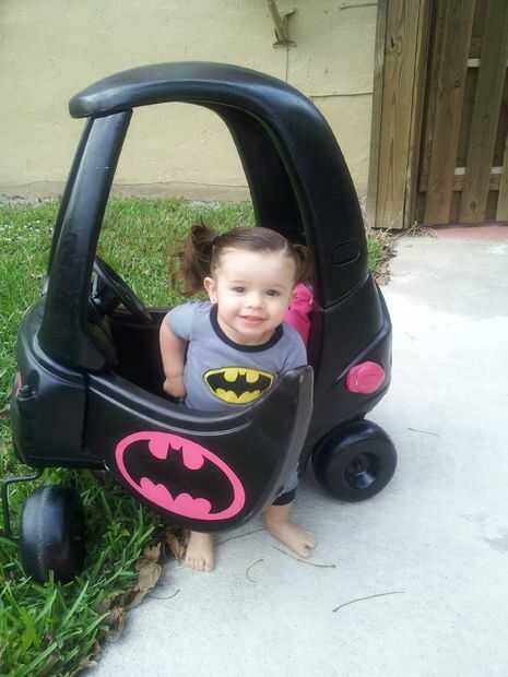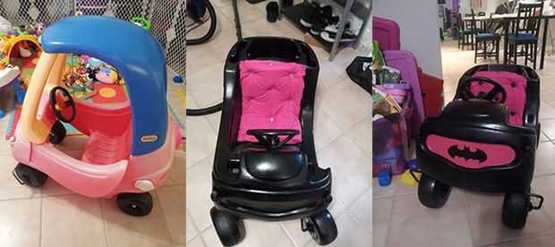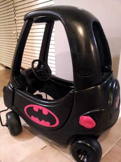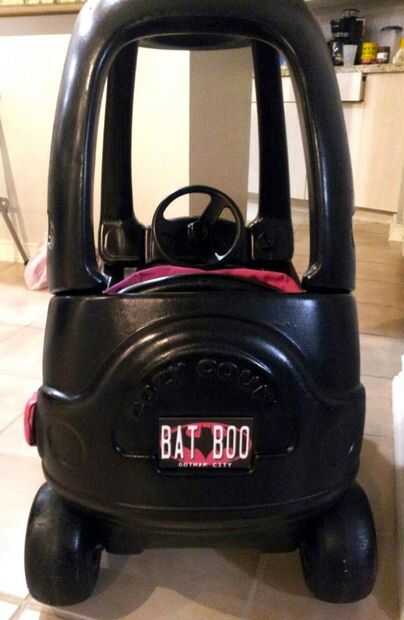 Después de pensarlo mucho decidí que definitivamente necesitaba un móvil de murciélagos. Hemos encontrado un "Coupé acogedor barato" en craigslist y había pasado una friolera de $10 en él. De allí, con una poco pintura graffiti en mi tienda (tienda de arte, Artarama de Jerry) grafix papel para los detalles, tela y piedras preciosas de JoAnn telas nos fijamos. Este fue un proyecto fácil de sábado que cuestan nada más que el total de $20. Por supuesto el costo varía de cuánto gastas en el coche. Tenemos suerte y para todo lo demás tenía cupones! Stinker ahora insiste en comer su almuerzo en su Batimóvil mientras mira TV.