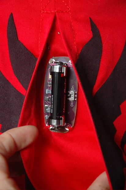 Te sugiero pegar velcro a su alimentación y a la tela. Con este método la fuente de alimentación es todavía extraíble, pero llevado a cabo firmemente en lugar. Coloque el lado n pricky de velcro sobre la alimentación y la parte suave del velcro sobre la prenda. De esta forma si usas la prenda sin la batería no se adhieren a cualquier cosa.