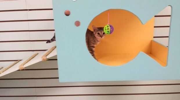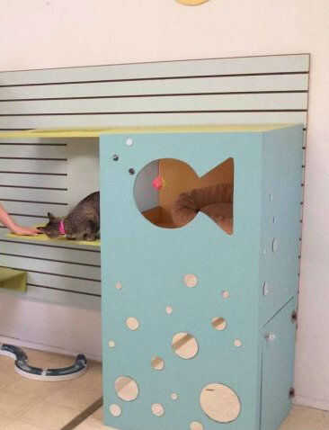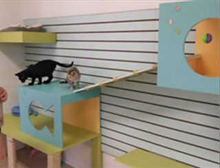 Hemos querido crear un muro de actividad para el cuarto adolescente gato a un refugio de animales local. Querían la pared actuar similar a las paredes de la actividad de cat en el criadero. Se planificó construir cubbies, estanterías y un lugar para celebrar una caja de litera. Hemos querido decorar con juguetes colgantes y de colores brillantes.