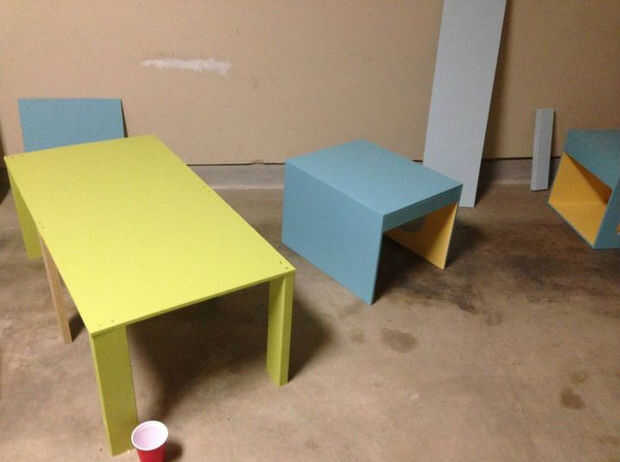 Montar el caja estante, cubículo #1 y #2, mesa y estante como se muestra en la imagen. Use pegamento para madera, clavos y tornillos según sea necesario.