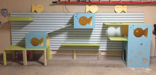 Siempre hemos pensado que sería cool tener una especie de pasarela para nuestro gato skulk y ocultar de manera anterior. Quería diseñar algo para toda la pared, algo que sería un poco artísticos, escultóricos y algo funcional para nosotros (además de