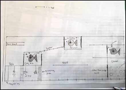 Siempre hemos pensado que sería cool tener una especie de pasarela para nuestro gato skulk y ocultar de manera anterior. Quería diseñar algo para toda la pared, algo que sería un poco artísticos, escultóricos y algo funcional para nosotros (además de