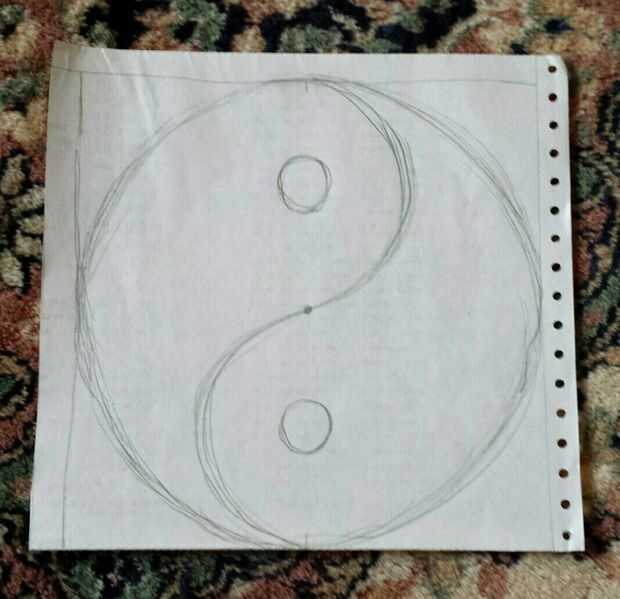 Importar una imagen de un símbolo de yin yang en un documento de word y que sea el tamaño que desee para el koi en el marco. Trazar en papel o imprimirlo antes de cortar la forma (todos excepto la onda circular de borde y centro). Ahora debe tener una plantilla de stencil-como guía donde colocas los koi.