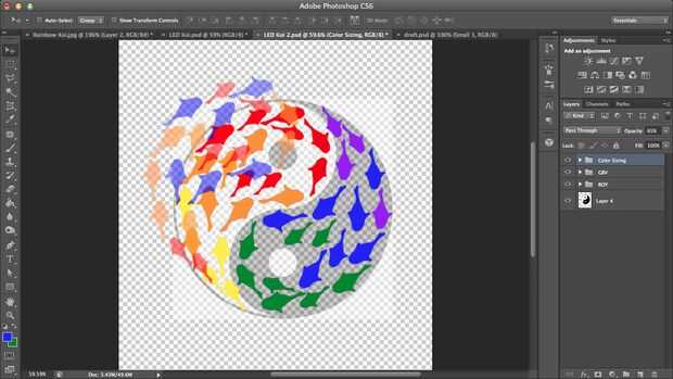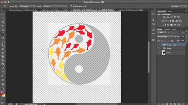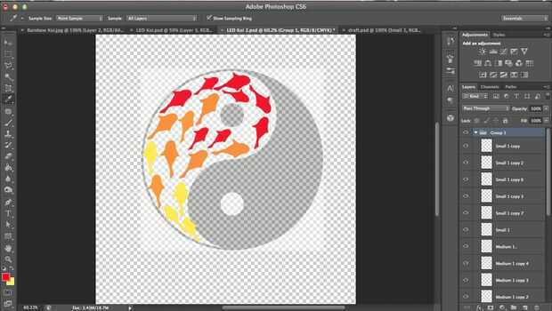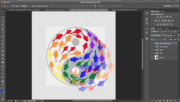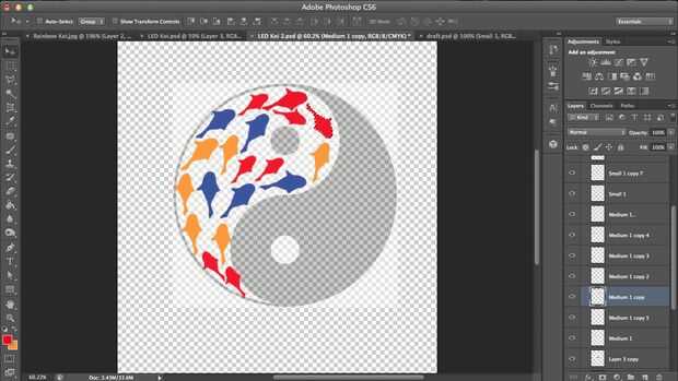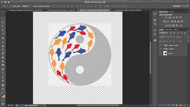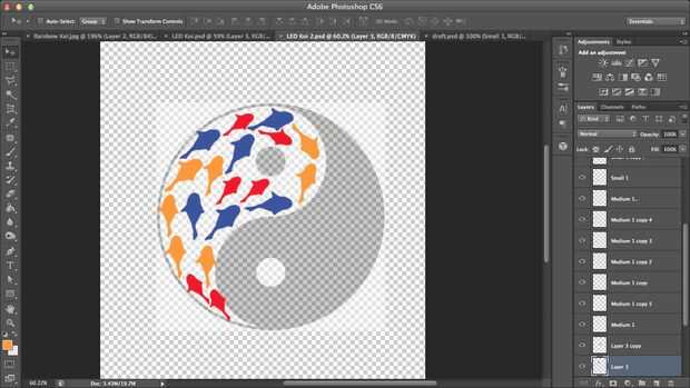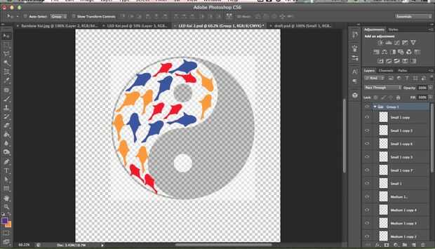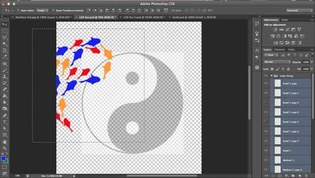 - Volver a tu primer archivo LED Koi tamaño y seleccione todas las capas en la barra de capas a la derecha (excepto la capa de yin yang). Con la herramienta mover en el menú de la izquierda ficha seleccionada, haga clic y arrastre los koi en su archivo más reciente (duplicado uno creado).