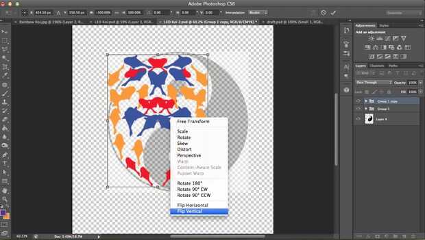 - Con el grupo duplicado seleccionado en la barra de capas, pulse Comando/ctrl + t para transformar. Haga clic en la imagen y haga clic en flip horizontal y luego flip vertical voltear su imagen [alrededor del origen].