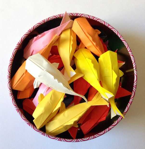Para hacer las carpas koi, diseñada por Sipho Mabona, utilicé un esquema en línea (cuyo link ya no funciona por alguna razón) y un video stop-motion del proceso de plegado, así que Diviértete! Es bastante complicado, especialmente los pliegues del eslabón giratorio, pero no dude en comentar abajo si te tienen dificultades y voy a intentar ayudar. Doblar tantos como desee, pero doblado 39 de ellas: 1 blanco, 2 color amarillo brillante, 3 amarillo-naranja, 2 naranja oscuro, 2 luz naranja, 7 rojas, 2 color de rosa, púrpura 5, azul oscuro 2, 5 azul medio, 4 cielo azul, 1 verde oscuro y 3 hoja verde.