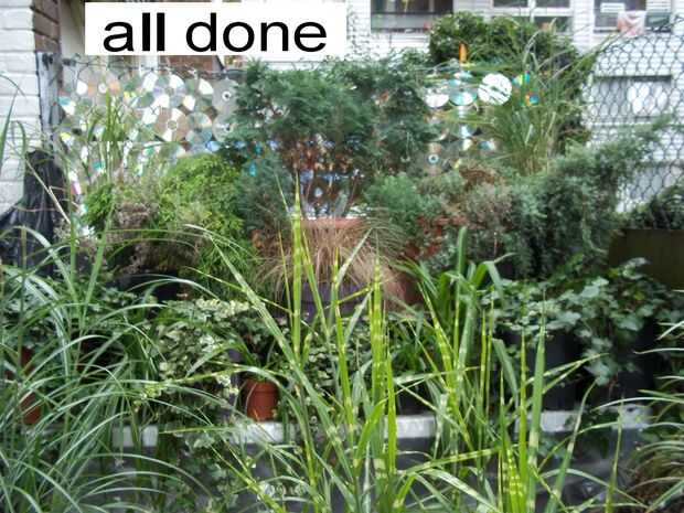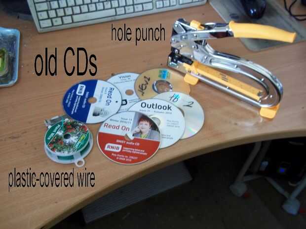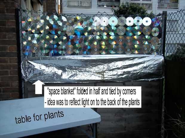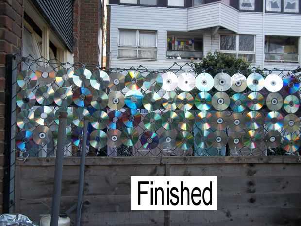 Usé alambre recubierto de plástico para unir los discos; eso fue todo lo que tenía a mano. Até los CDs en las tiras, más fácil para colgar en la parte superior de la valla – habría cedió en el medio si había intentado encadenarles en filas de lado a lado.