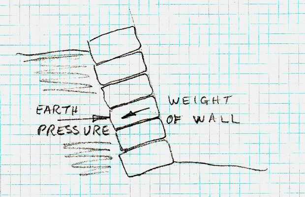 Si la pared se inclina hacia la tierra el peso del muro contrarresta la presión de la tierra y la pared se mantiene estable. También dan a su paisaje una apariencia más suave. Tenga en cuenta que cada piedra es inclinada hacia atrás. De esa manera la presión de la tierra tiene que levantar las piedras para moverlas. Si coloca cada piedra en nivel entonces puede todavía resbalan hacia fuera.