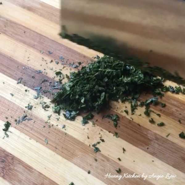 Limpiar, lavar las hojas de curry y les seco pat. Colocar en la tajadera y picar finamente.