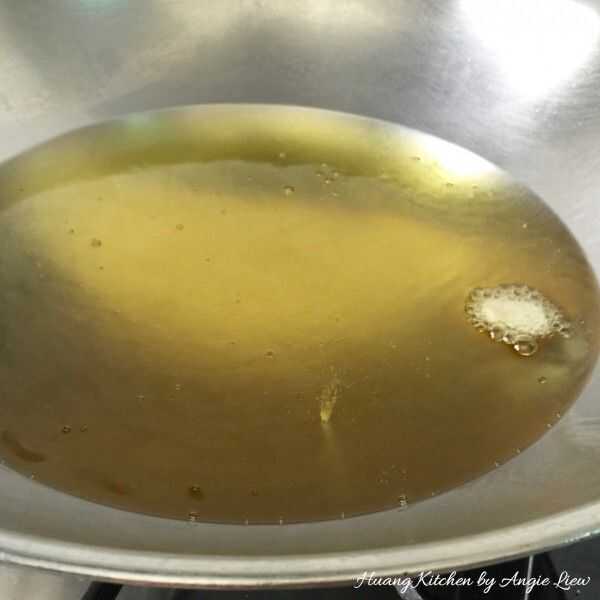 Calentar suficiente aceite en un wok o sartén. Añadir una pizca de masa y si levanta inmediatamente con chisporroteos, entonces el aceite está listo.