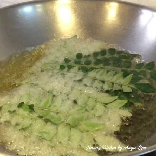 Luego, freír algunos tallos de hojas de curry fresco en el aceite. Vaciar las hojas de curry frito una vez que el sabor ha sido liberado en el aceite, unos 3 minutos.