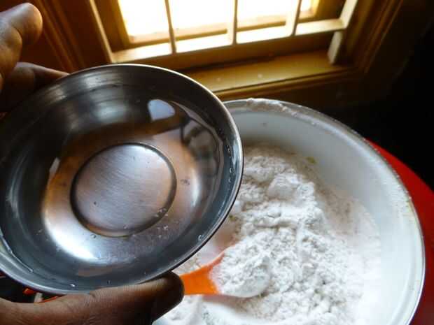 • Añadir poca cantidad de agua tibia a la harina Murukku y mezclar con la mano