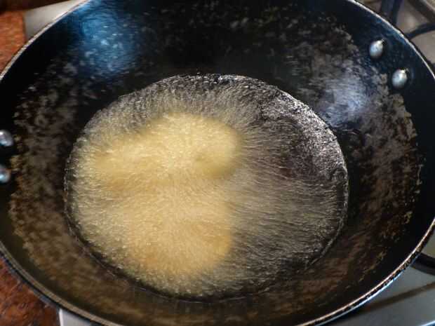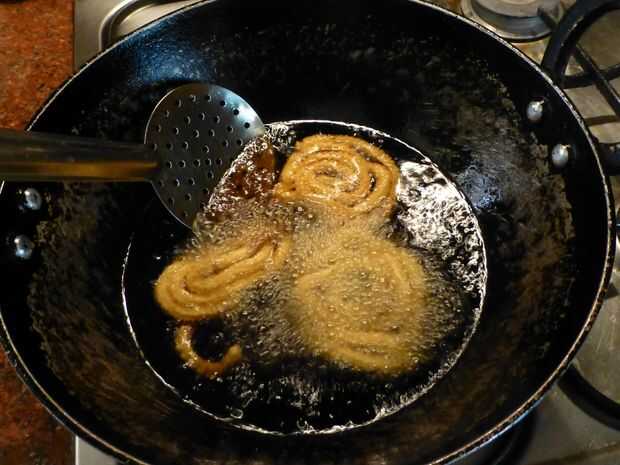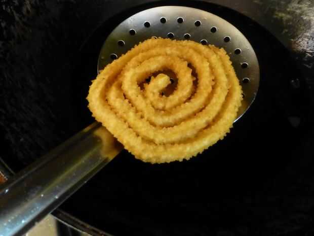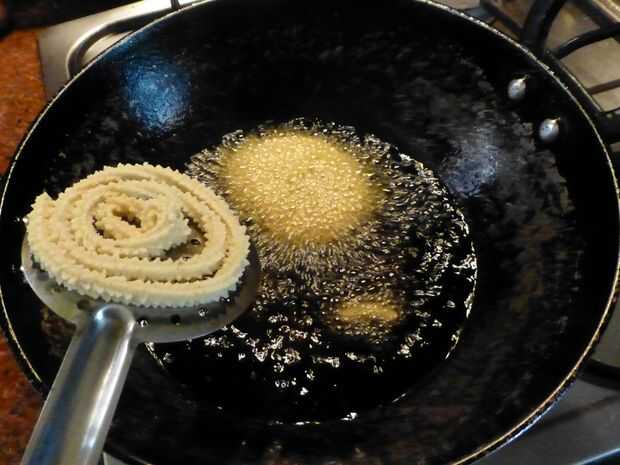 - Utilizando el filtro, a un lado murukku en aceite caliente, se fríen uniformemente