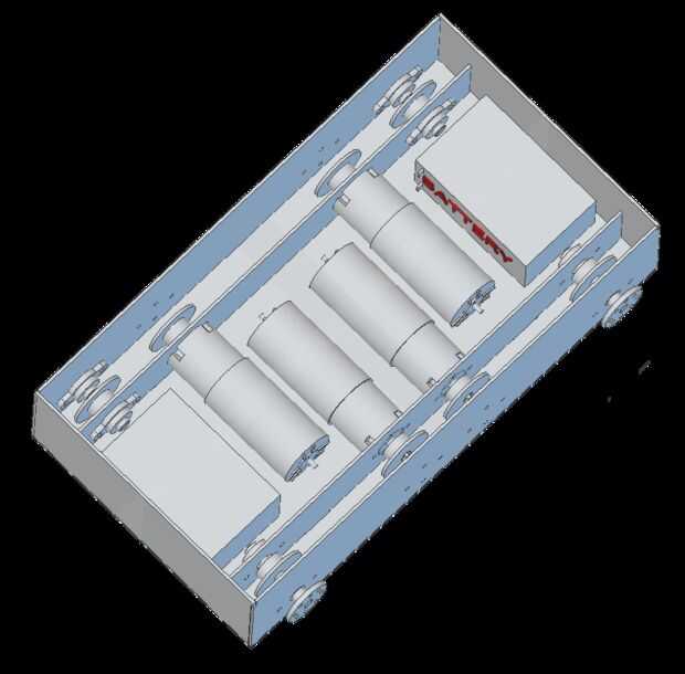 Hemos diseñado el robot en una herramienta de CAD 3D relativamente barata llamada Alibre. Puede descargar nuestros archivos de diseño de Alibre aquí. Hemos diseñado el robot a partir de 1/8" aluminio - aunque no hay razón que no podía hacerse de acero. Diseñando en pequeñas lengüetas entrelazadas donde se reúnen las hojas de aluminio, es mucho más fácil de montar correctamente el robot antes de soldar. Las imágenes muestran nuestro diseño de chasis y tren de la impulsión.