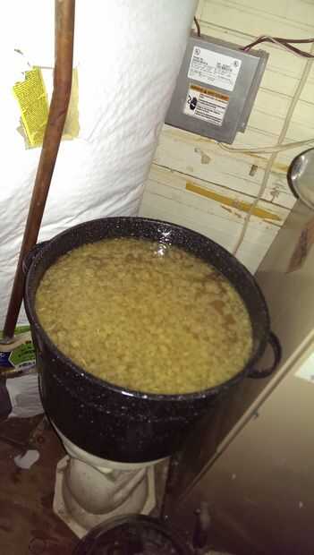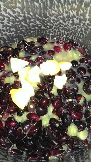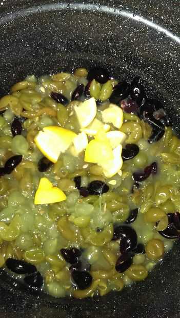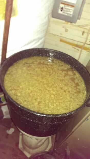 poner el puré de uvas, limón troceado, el azúcar y el agua en primer fermentador, revolver dos veces al día.