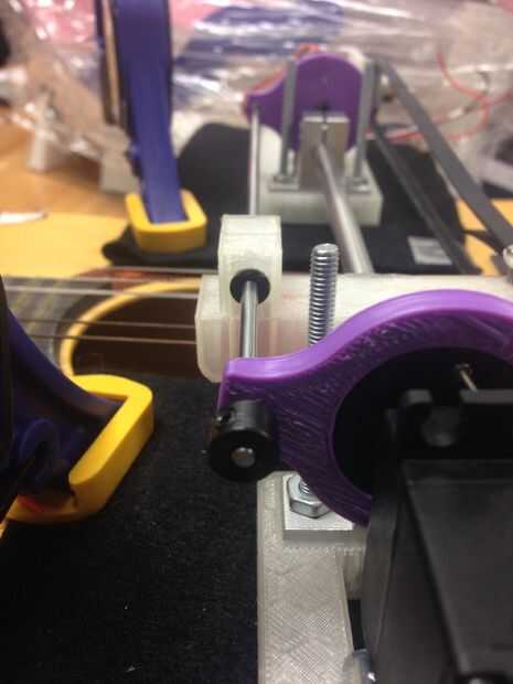 2. Deslice el carro de pick en el eje de 8 mm, garantizando que el rectángulo que sobresale de la cesta de recogida es en el mismo lado del eje que las partes sobresalientes de los conectores de motor servo de la espiga.