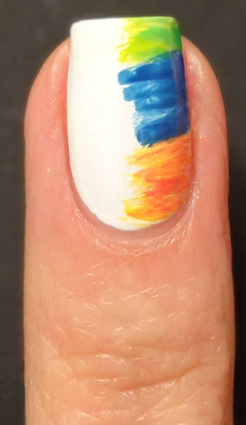 Dab sus pulidos en su paleta y delgada hacia fuera un poco con el esmalte de uñas de OPI más delgado. Con un cepillo de ángulo pequeño, aplicar unas pinceladas de la más ligera sombra de cada color en las uñas. (Limpie el pincel entre colores con su solución de limpieza de cepillo)
