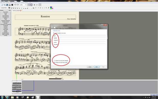 Aparecerá el Asistente de la nueva escala. En la primera sección, puede introducir el título, subtítulos, compositor, letrista y arreglista y autor fecha. También puede hacer clic si desea crear una partitura desde cero o desde una plantilla. Para este ejemplo voy a crear la canción Twinkle Twinkle Little Star. Voy a crear una partitura desde cero, pero voy a llegar a crear una partitura desde una plantilla. Acabado a elegir sus opciones y luego haga clic en siguiente.
