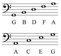 Estos juego de llaves se llaman las teclas de "Bass Clef". Como se indicó anteriormente antes de que jugaron con su mano izquierda. Para las líneas en el personal de "Bass Clef" hay que saltar una letra a partir de "C media". Para las líneas constará de las teclas: G-B-D-F-A se puede recordar fácilmente estas teclas como "Buena muchachos hacer bien siempre". En los espacios del personal "Bass Clef" consta de las teclas A-C-E-G puede recordar fácilmente estas teclas como "Todas las vacas comen hierba". Una vez que te acuerdas de esas siglas se fijase en la mano izquierda.