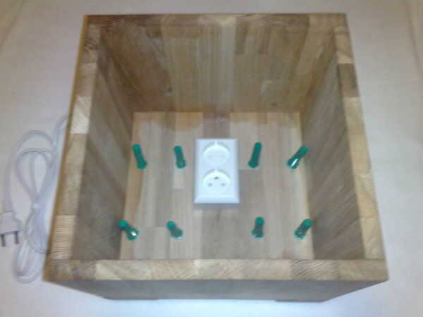 4. con las anclas en la medida del lugar donde debe ser la toma y el taladro un agujero directamente a través del fondo para la energía del cable. (Mina estaba en el centro de la caja)