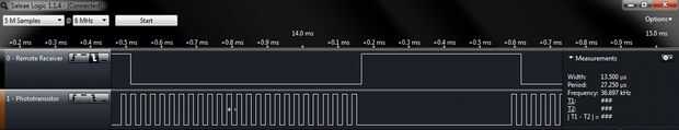 He cableado una configuración pequeña prueba con un mando a distancia al azar que tengo puesta alrededor. A continuación se muestran formas de onda de salida de un fototransistor crudo junto con la salida de la TSOP34338. Abra los archivos logicdata (o mirar las imágenes sin comprimir), observe que la forma de onda muestra que la luz IR cruda es pulsación a cerca de 37 KHz, y hay un ligero retraso en la respuesta del receptor.